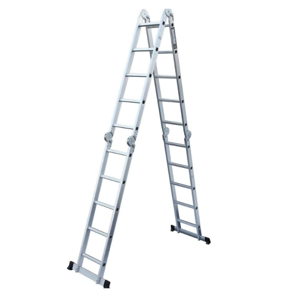 L'échelle articulée 4x3 marches est la solution la plus compacte et polyvalente pour vos travaux. Avec ses 12 marches au total, elle permet d'atteindre une hauteur de 3,70 m en position droite. Ultra-légère, elle se transforme facilement en escabeau ou en petit échafaudage pour une flexibilité totale.