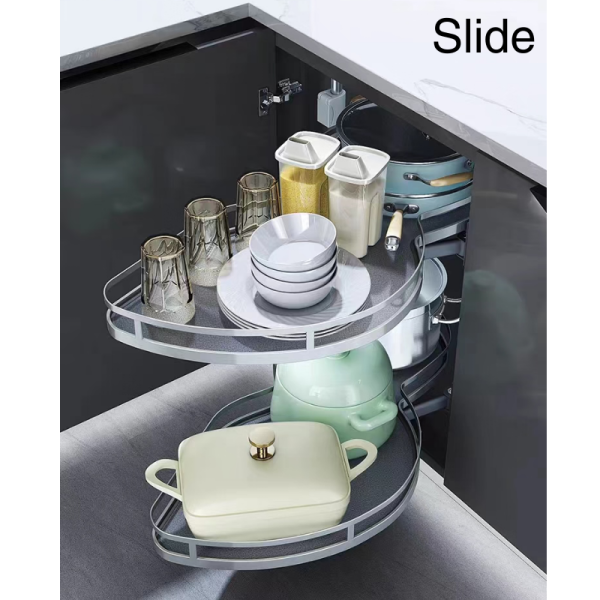 Le système Slide D720mm résout définitivement le problème des placards profonds où les objets restent oubliés au fond. Grâce à ses deux plateaux demi-lune indépendants, le contenu de votre meuble d'angle vient directement à vous. Que ce soit pour ranger des casseroles lourdes ou des provisions, le mécanisme de rotation est conçu pour rester souple et silencieux, même sous pleine charge.
